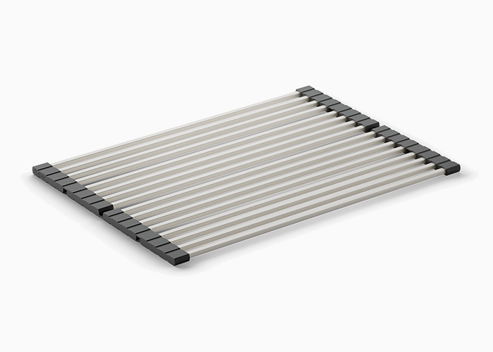Doordacht vouwdesign, gemakkelijk op te bergen. De afdruiprooster bestaat uit geslepen holle staven van roestvrij staal die in slipvrije, omlijnde strips van silicone ingezet zijn. Daardoor wordt de ondergrond tegen krassen beschermd, zodat de rooster op alle werkbladen gebruikt kan worden. De rooster is geschikt voor levensmiddelen en daardoor ook geschikt om groenten te wassen en schoon te maken.
