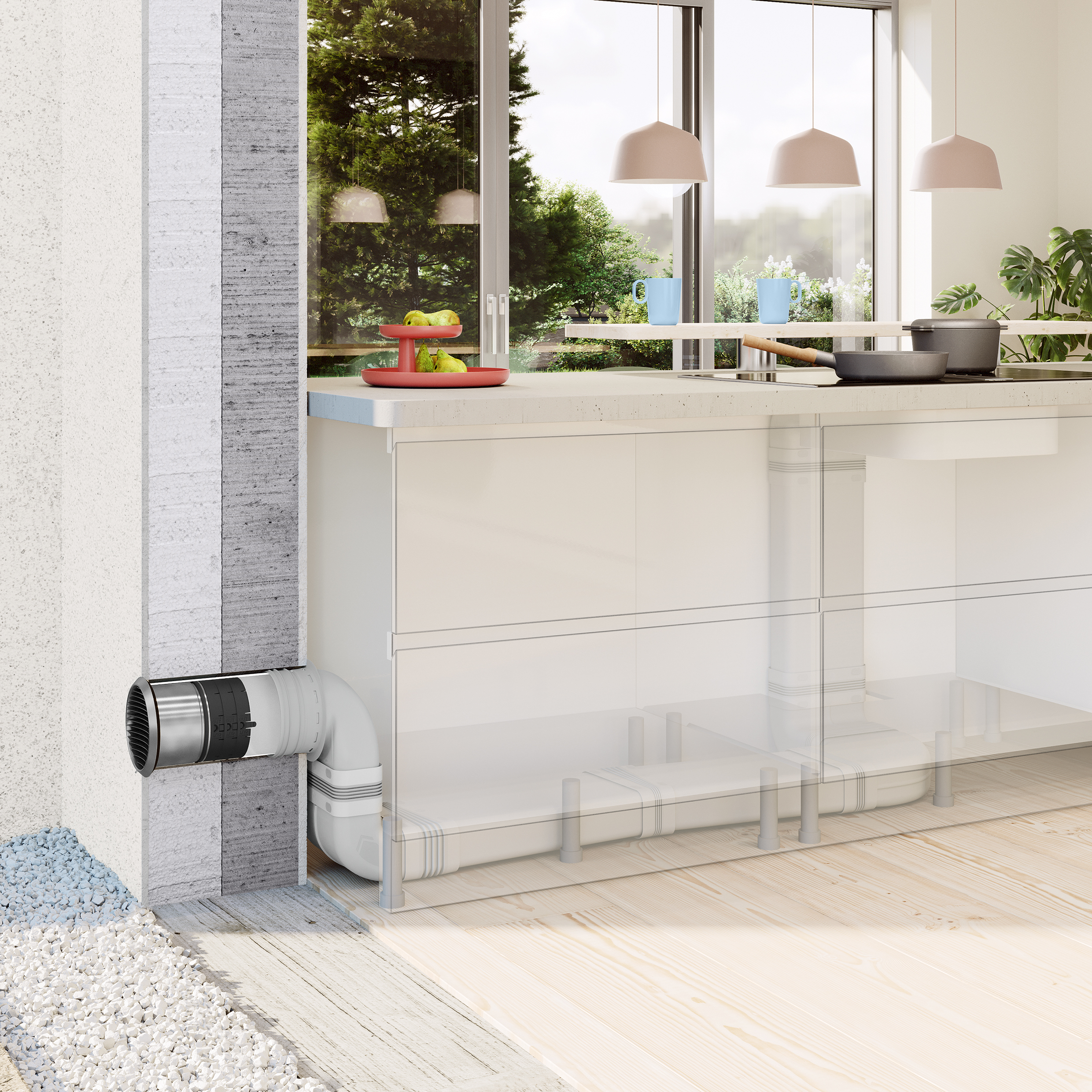 Het door Naber ontwikkelde, aerodynamisch geoptimaliseerde geleidingssysteem COMPAIR PRIME flow® herleidt luchtweerstanden tot een minimum, zodat de kookdamp zelf over langere afstanden en in bochten haast zonder stromingsverliezen afgevoerd wordt. In combinatie met een passende warmtegeïsoleerde muurdoorvoerunit wordt de damp volledig het gebouw uit geleid – ook bij kookeilanden. Dankzij qua stroming geoptimaliseerde geometrieën blijft het energieverbruik controleerbaar, warmteverliezen worden tot een minimum herleid.