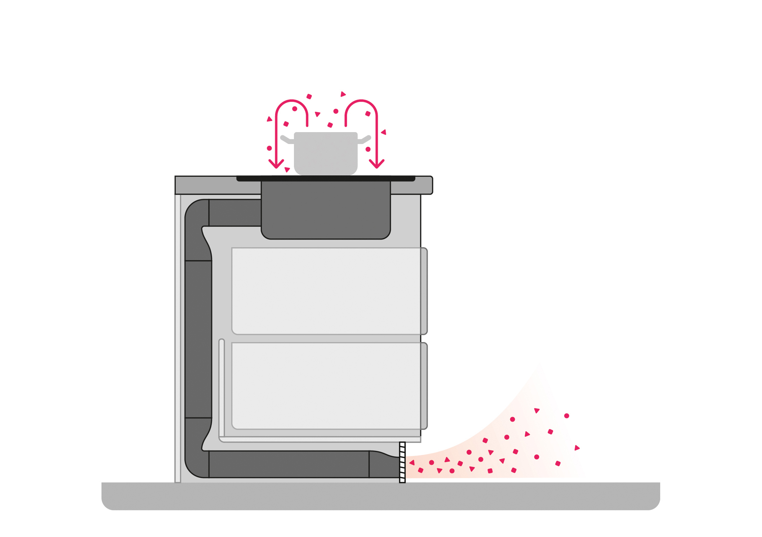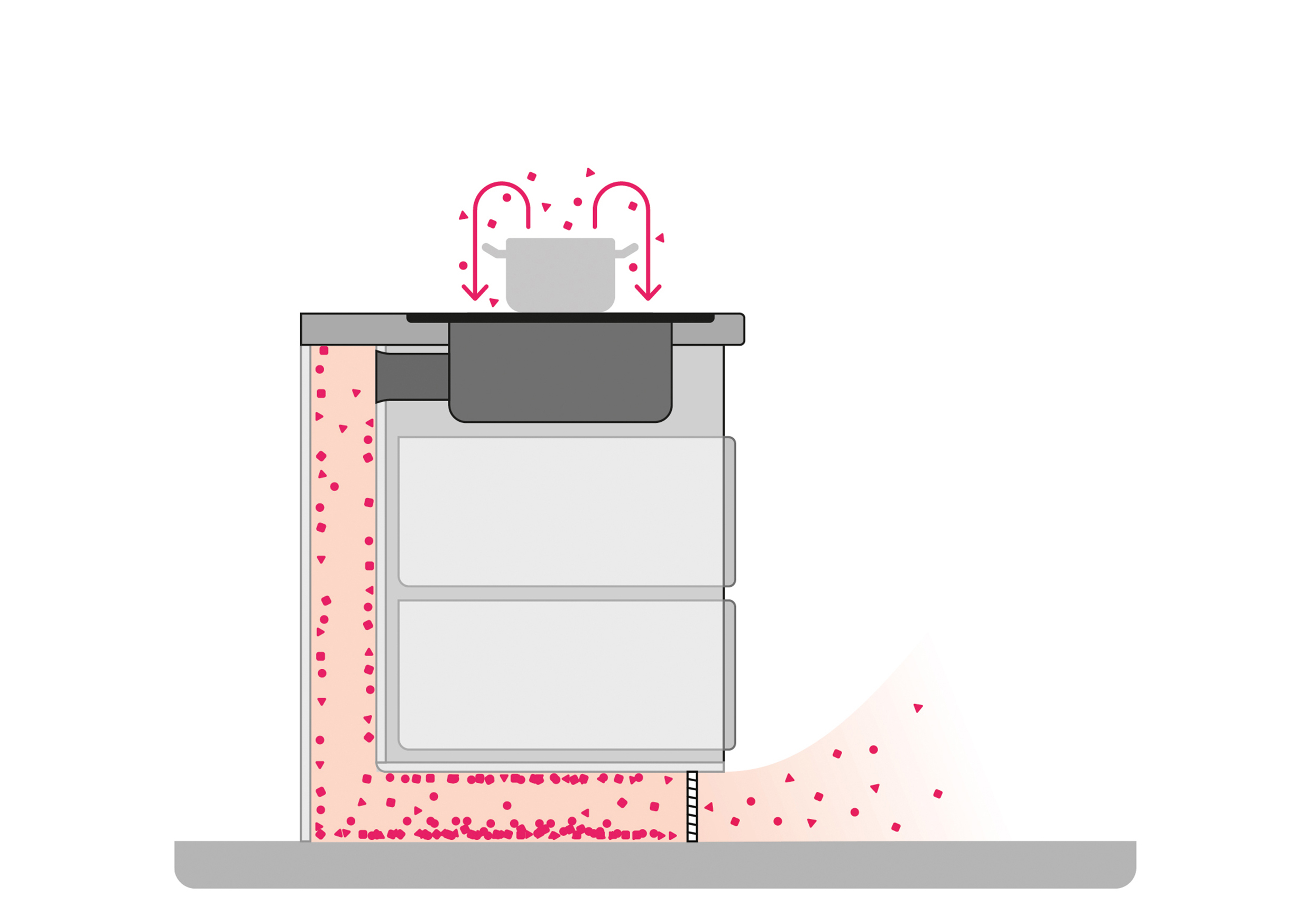 Wordt de tijdens het koken tot stand komende kookdamp – een mengsel van vocht, vet- en stofdeeltjes – enkel en alleen tot in of onder het meubelcorpus geleid, dan bestaat daarbij het risico op condensaatneerslag aan omringende oppervlakken. De gevolgen kunnen van opgezwollen kastelementen, vochtige wanden en beschadigde vloerbedekkingen tot hardnekkige vetophopingen en voor de gezondheid schadelijke schimmelvorming gaan. Voor keukenstudio’s en -planners betekent dit niet alleen ontevreden klanten, maar in geval van twijfel ook juridische geschillen en hoge reparatiekosten. Een technisch perfecte oplossing vereist daarom altijd een gesloten luchtgeleiding – ofwel tot in de open lucht, ofwel gecontroleerd terug tot in de verwarmde ruimte.