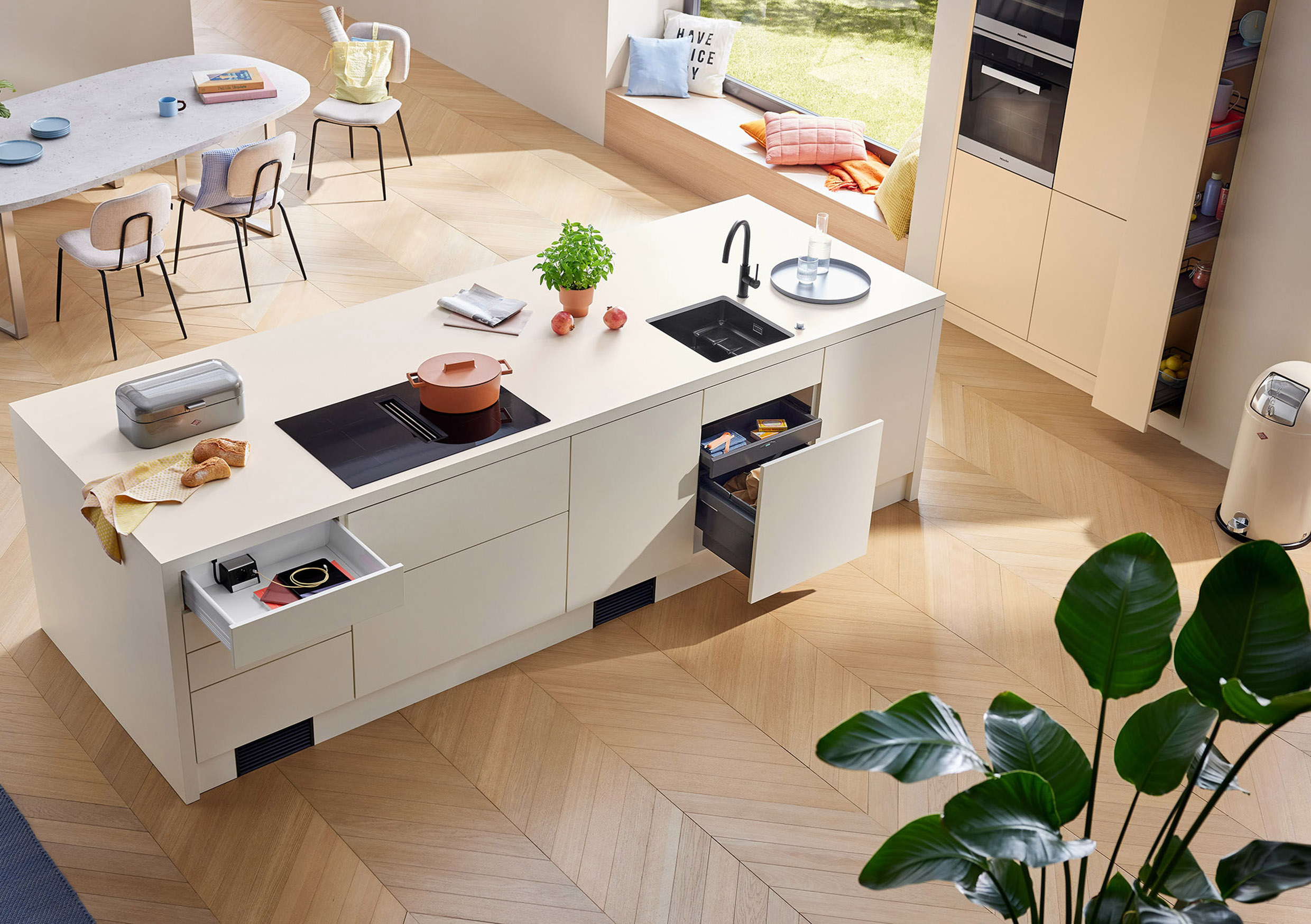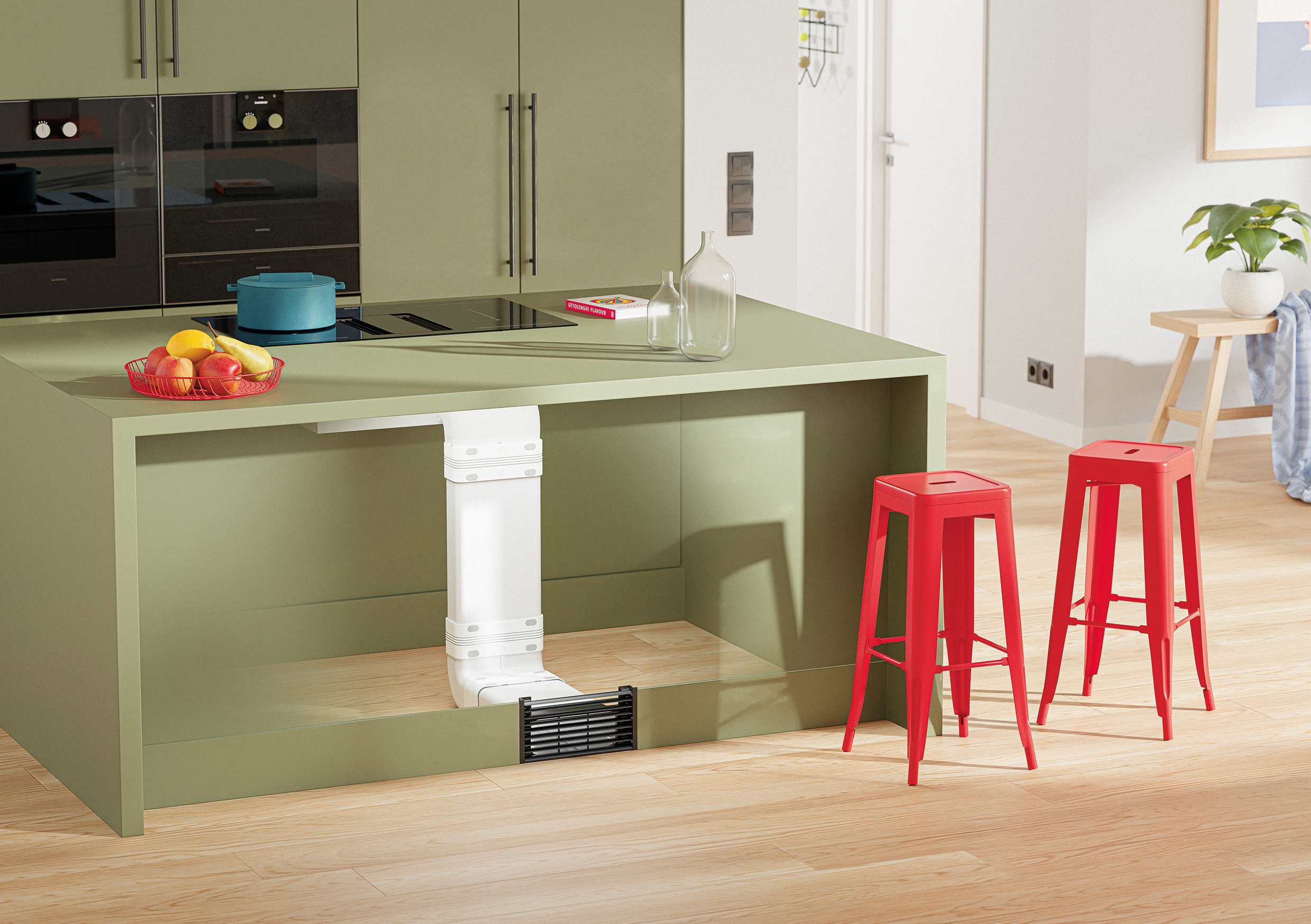 Waar bouwkundige omstandigheden geen luchtafvoeroplossing toelaten, biedt Naber ook voor de ventilatie een technisch onberispelijk alternatief. Beslissend is dat de gereinigde damp niet ongecontroleerd in het meubelcorpus blijft zitten, maar door middel van het luchtdichte, gesloten kanaalsysteem COMPAIR PRIME flow® veilig het sokkelbereik uit geleid wordt. Hier komen naast het steekbare luchtkanaalsysteem speciale sokkeloplossingen en de modulaire filterbox COMPAIR® GREENflow aan bod. Laatstgenoemde vervangt actief koolfilters van de fabrikant in de kookveldafzuiging door een performante, onderhoudsvriendelijke variant. Een omegavormig filterelement vergroot het actief filteroppervlak, verhoogt het afgezogen debiet aan de kookveldafzuiging en verlengt de onderhoudsintervallen. Het filter is bovendien meervoudig te regenereren, wat de lopende bedrijfskosten duidelijk doet afnemen en natuurlijke hulpbronnen ontziet. Het in het sokkelbereik geïnstalleerde filter leidt de gereinigde lucht gecontroleerd terug tot in de ruimte, waar resterend vocht via de algemene ventilatie in de woonruimte afgevoerd wordt.
