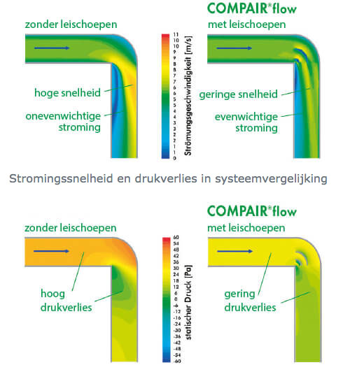 Naber COMPAIR® flow luchtkanaalbochtstukken met leischoepen garanderen minimaal stromingsverlies.