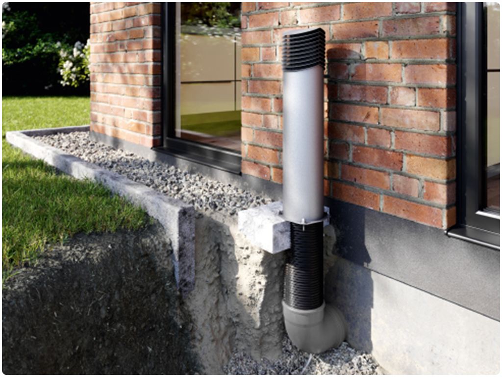 De qua vorm mooie, weerbestendige uitlaat van roestvrij staal wordt door de klant met een KG 160 buis aangesloten. Hij staat vrij op het stuk grond of is direct aan de muur van het huis bevestigd. In het bijgeleverde, uit een kanaalbodembuis bestaande 90°-boogelement is een condensaatafvoer geïntegreerd die tot stand komend condensaat en regenwater veilig tot in het aardrijk afvoert.