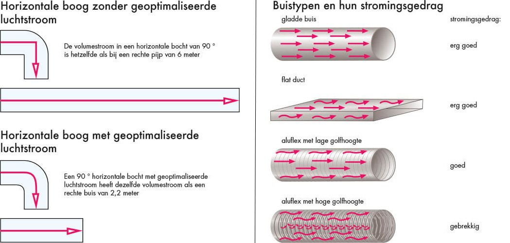 Iedere extra meter leiding en elk bochtstuk verhogen de werveling en zorgen voor drukverliezen. Plan de luchtafvoer-luchtgeleiding zo kort mogelijk.