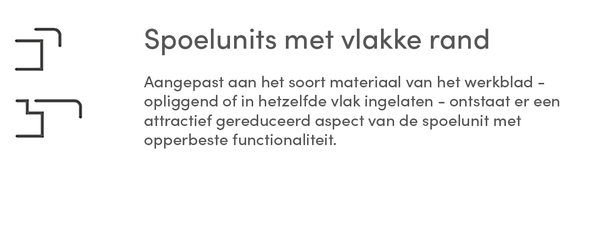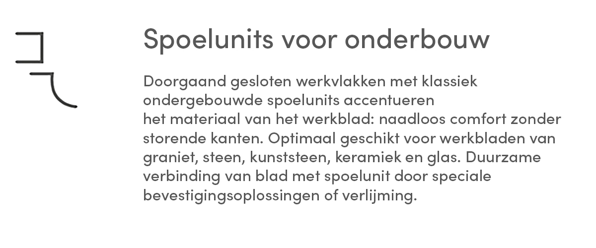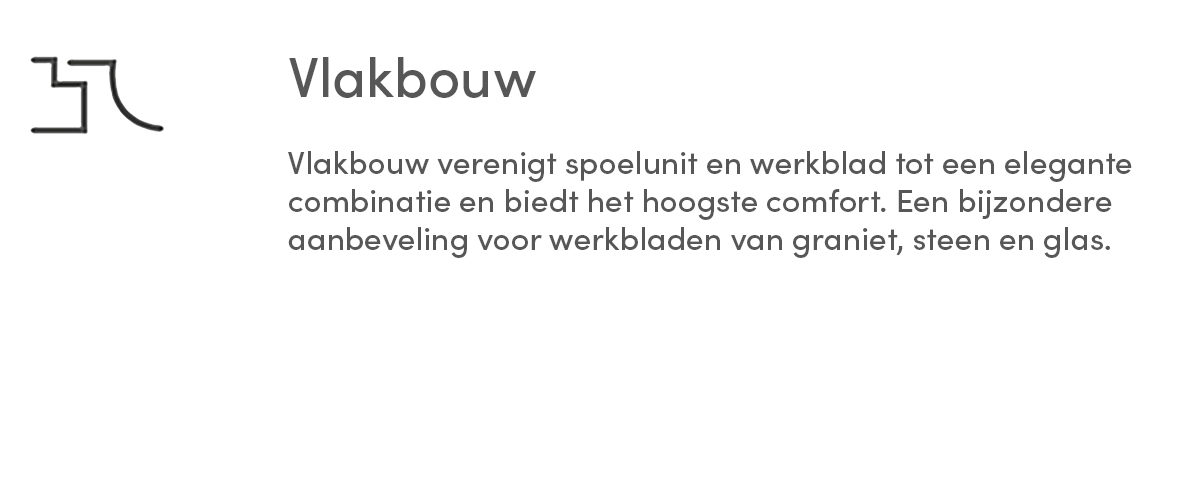 Welk type van inbouw-spoelunit gekozen wordt, hangt niet alleen van de keukenarchitectuur af. Ook het materiaal van het werkvlak en persoonlijke voorkeuren bepalen de keuze. Inbouw-spoelunit met vlakke rand, vlakbouw-spoelunit of onderbouw-spoelunit – dat maakt niet uit: elk inbouwtype heeft zijn specifieke voordelen. En daar bovenop alle pluspunten van de NABER-CONTURA® keukenspoelunits!